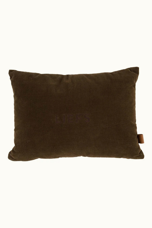 Dit bruine Zusss kussen van 35x25cm voelt heerlijk zacht aan dankzij de corduroy stof en geeft knusse warmte aan elk interieur. Met de subtiele tekst 'Liefs' krijgt het kussen een persoonlijke touch die het extra speciaal maakt.