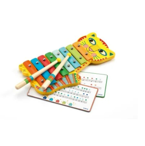 Artikelnummer: DJ06002 OverzichtEen prachtige katvormige metallofoon voor kinderen, prachtig geïllustreerd. Je kind speelt de noten met de houten stokjes. Er is twee keer dubbelzijdig bladmuziek meegeleverd om je kind te begeleiden, die door de toetsen van een kleurcode zijn voorzien. Het ideale geschenk voor kleine muzikanten vanaf 3 jaar.