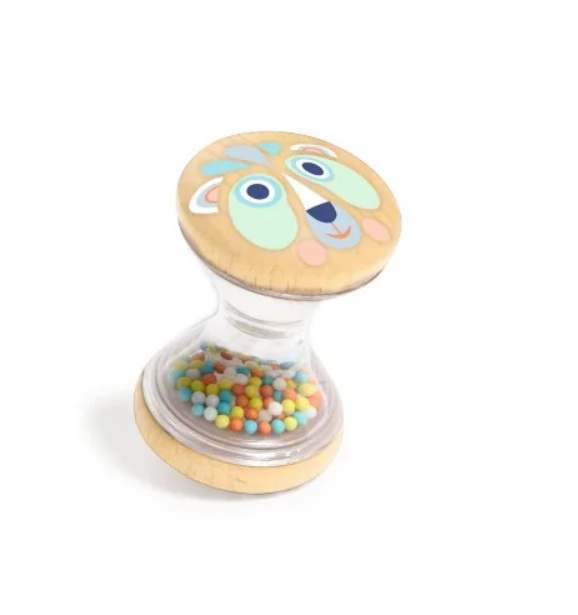 Artikelnummer: DJ06182 OverzichtEen natuurlijke houten rammelaar met een pastelkleurig beertje, voor babys vanaf 3 maanden. Kleine gekleurde balletjes om naar te kijken en te luisteren. Materiaal: hout en kunststof
