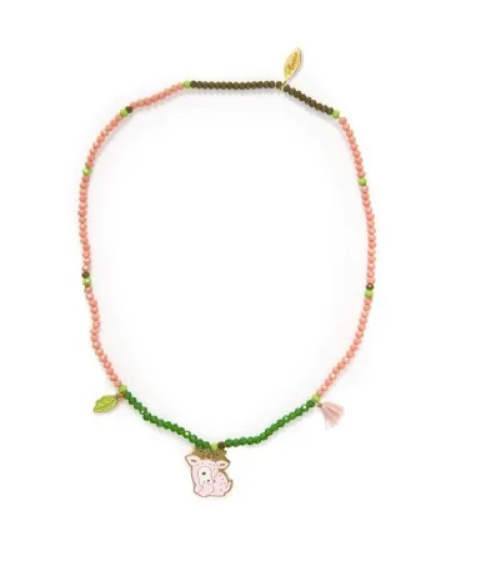 Artikelnummer: DD05720 OverzichtDuik in de betoverende wereld van het bos met de Sylvia-ketting. Bestaat uit acryl kralen en drie delicate versieringen: een hindebedeltje, een bladbedeltje van geëmailleerd metaal en een katoenen kwastje. Deze ketting combineert elegantie en verfijning. De dubbele elastische draad zorgt voor optimale stevigheid en maakt het omdoen gemakkelijk, zonder sluiting.