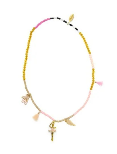 Artikelnummer: DD05780 OverzichtDuik in de gracieuze wereld van de dans met de Isadora-ketting. Bestaat uit acryl kralen en vijf delicate versieringen: drie bedeltjes van geëmailleerd metaal met een ballerina, een vleugel en een ballerinaschoentje, en twee katoenen kwastjes. Deze ketting combineert elegantie en lichtheid. De dubbele elastische draad zorgt voor optimale stevigheid en maakt het omdoen gemakkelijk, zonder sluiting.