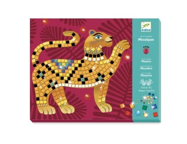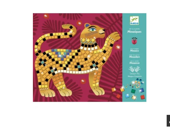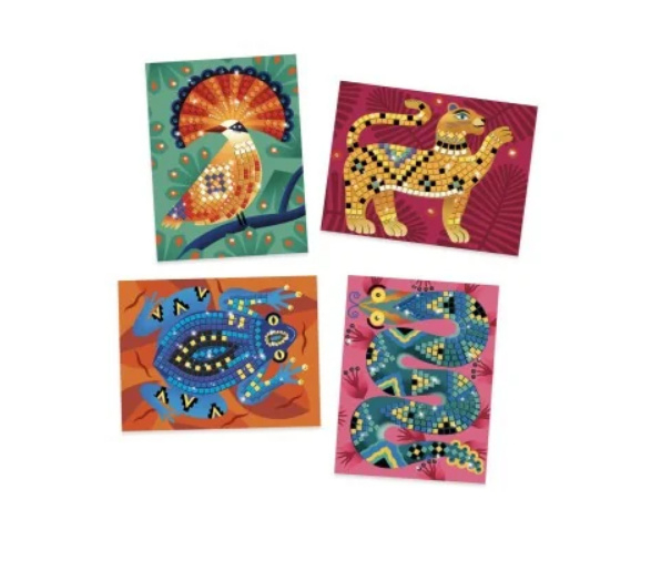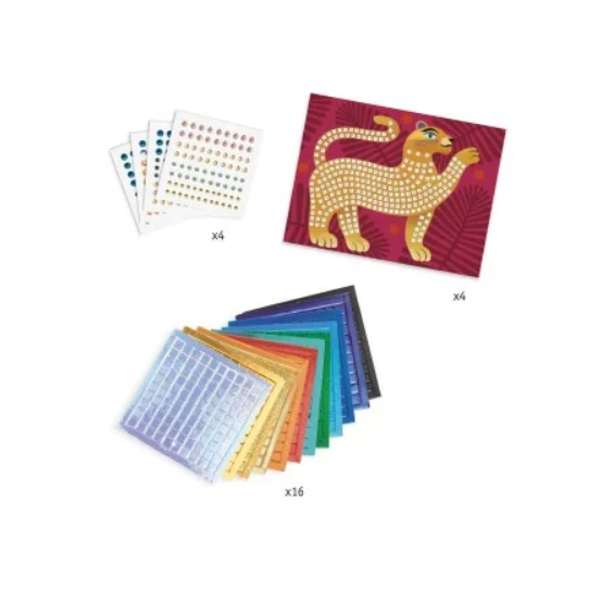 Duik in het hart van de jungle met deze mozaïekset voor beginners. 4 borden om aan te vullen met kleine vierkantjes van metallic foampapier en strassteentjes die als stickers kunnen worden gebruikt. De kinderen zoeken de getallen en plakken de bijbehorende stukjes op de aangewezen plaats op de kleurplaat. De tekeningen worden gevuld en de jungle wordt versierd met glinsterende zonnestralen.
