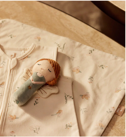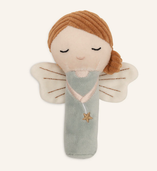 Fairy Amy is nu ook te vinden op deze veel te lieve rammelaar! Deze vrolijke rammelaar is ideaal voor kleine ontdekkers. Dankzij het handvat onderaan kan je kleintje de rammelaar makkelijk vasthouden, en door het feetje te schudden, hoort je mini de vrolijke geluidjes. De fairy in de kleur Sea Green sluit perfect aan bij de andere "Lovely Birds" items en biedt uren speelplezier!