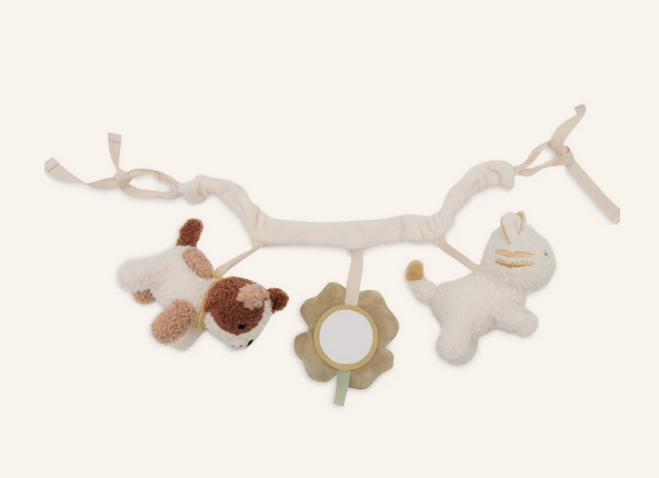 Deze schattige wagenspanner is een echte blikvanger voor in de kinderwagen en zorgt voor urenlang speelplezier! De drie lieve hangertjes – een tulp, een schattig vogeltje en een vogelhuisje met spiegel – maken het onderweg extra leuk voor je kleintje. De knispergeluidjes en vrolijke belletjes maken de wagenspanner helemaal compleet.