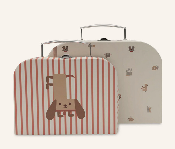 Deze speelkoffertjes uit de Animal Friends collectie zijn perfect voor je kleintje! Het buitenste koffertje heeft een vrolijke all-over print, terwijl het binnenste koffertje een warme soft terra kleur heeft met een schattig hondje erop. Beide koffertjes zijn afgewerkt met een milky coffee ruitje aan de binnenkant en de tekst ‘belongs to’, zodat ze goed te herkennen zijn. Ideaal voor het opbergen van kleine spulletjes of als eye catchers in de babykamer!?