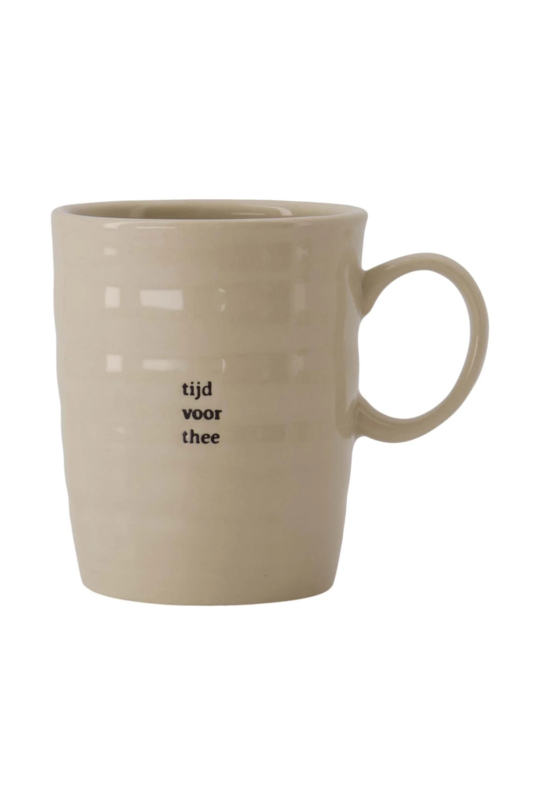 De Zusss theemok zand is perfect voor elk theemoment. Deze theemok zand is gemaakt van stevig keramiek en heeft een warme, natuurlijke zandkleur die rust uitstraalt. Met afmetingen van ongeveer 9 cm hoog en een comfortabele oorring, geniet je eenvoudig van je favoriete thee. Deze Zusss theemok zand heeft een speels, handgemaakt effect door het lichte reliëf en de opdruk ‘tijd voor thee’ in zwarte letters. Combineer de theemok met onze koken en tafelen artikelen.