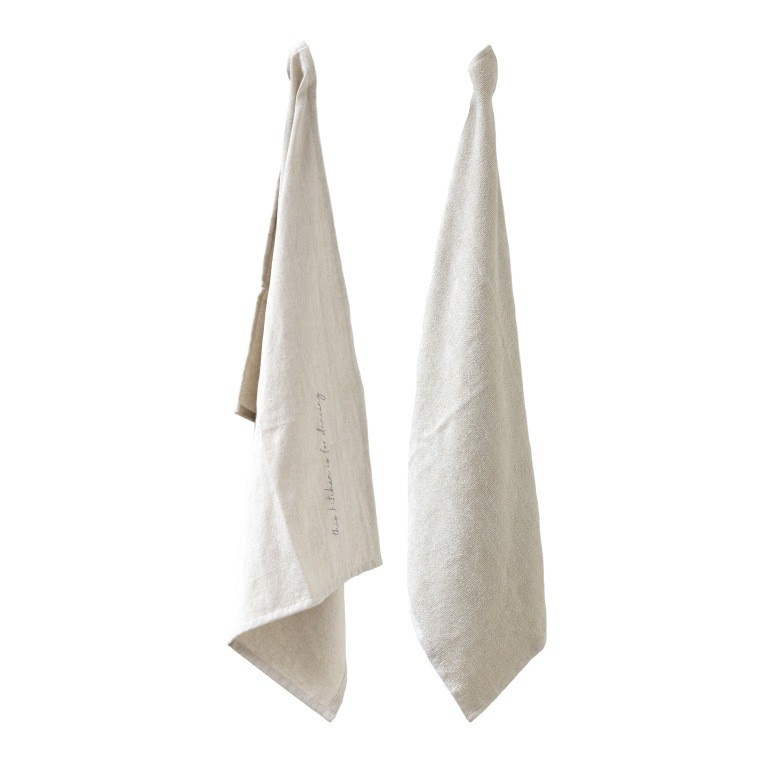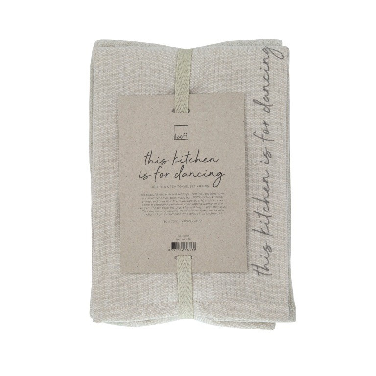 Deze mooie keukendoekenset van Leeff bevat een theedoek en een handdoek, beide gemaakt van 100% katoen, wat zorgt voor zachtheid en duurzaamheid. De doeken zijn 50 x 70 cm groot en komen in een mooie aardetint, die warmte toevoegt aan elke keuken. De theedoek heeft een leuke en speelse bedrukking met de tekst 'This kitchen is for dancing'. Perfect voor dagelijks gebruik of als cadeau voor iemand die wel van wat plezier in de keuken houdt!