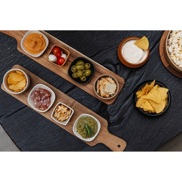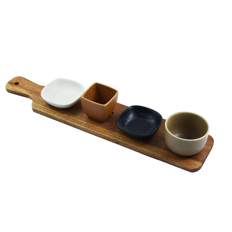 Deze serveerset bestaat uit een acaciahouten serveerplank met vier keramieken schaaltjes. Perfect voor het serveren van snacks, dips of tapas. Dankzij de handige inkepingen blijven de schaaltjes stevig op hun plek en verschuiven ze niet bij het optillen van de plank. De schaaltjes zijn vaatwasser bestendig.