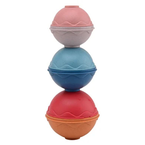 De set bestaat uit 8 halve ballen in verschillende formaten en een rond speelballetje. De halve ballen kunnen aan elkaar gedraaid of opestapeld worden. Geschikt vanaf 18 maanden.