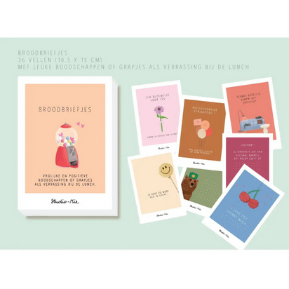 Artikelnummer: KMBBBROOD Overzicht36 vellen broodbriefjes 11,5 cm op 15 cm Vrolijke en positieve boodschappen of grapjes als verrassing bij de lunch!
