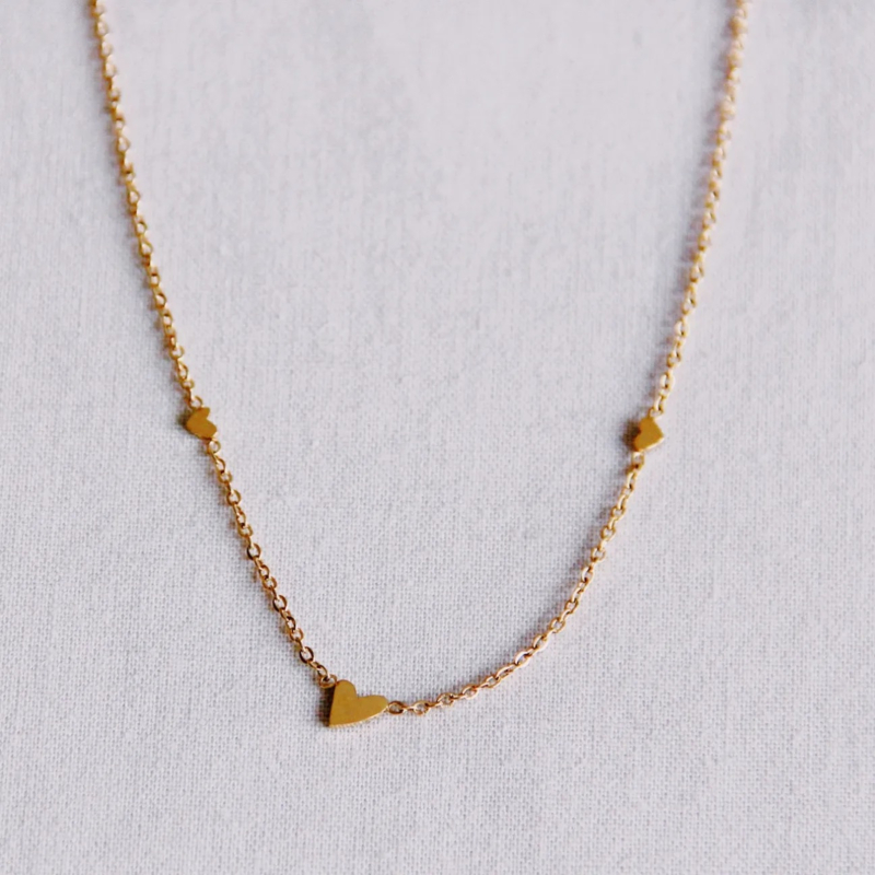 bazou fijn kettinkje met 3 mini hartjes goudBazou fijn kettinkje met 3 mini hartjes goudDit schattige minimalistische kettinkje met drie hartjes is perfect om je look een subtiele touch te geven. Het kettinkje is super om je eigen necklace party af te maken of om cadeau te…