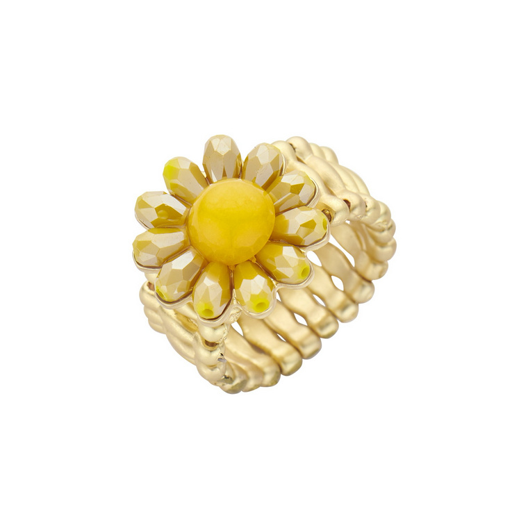 biba ring metaal en crystal kralen bloem geelHet leven kan zo simpel zijn met gewoon een stretch ring op elastiek die dan zomaar om heel veel vingers past. Ook bij de dames die vinden dat ze grote knokkels hebben en dat dan geen enkele ring goed past. Nu dus wel!